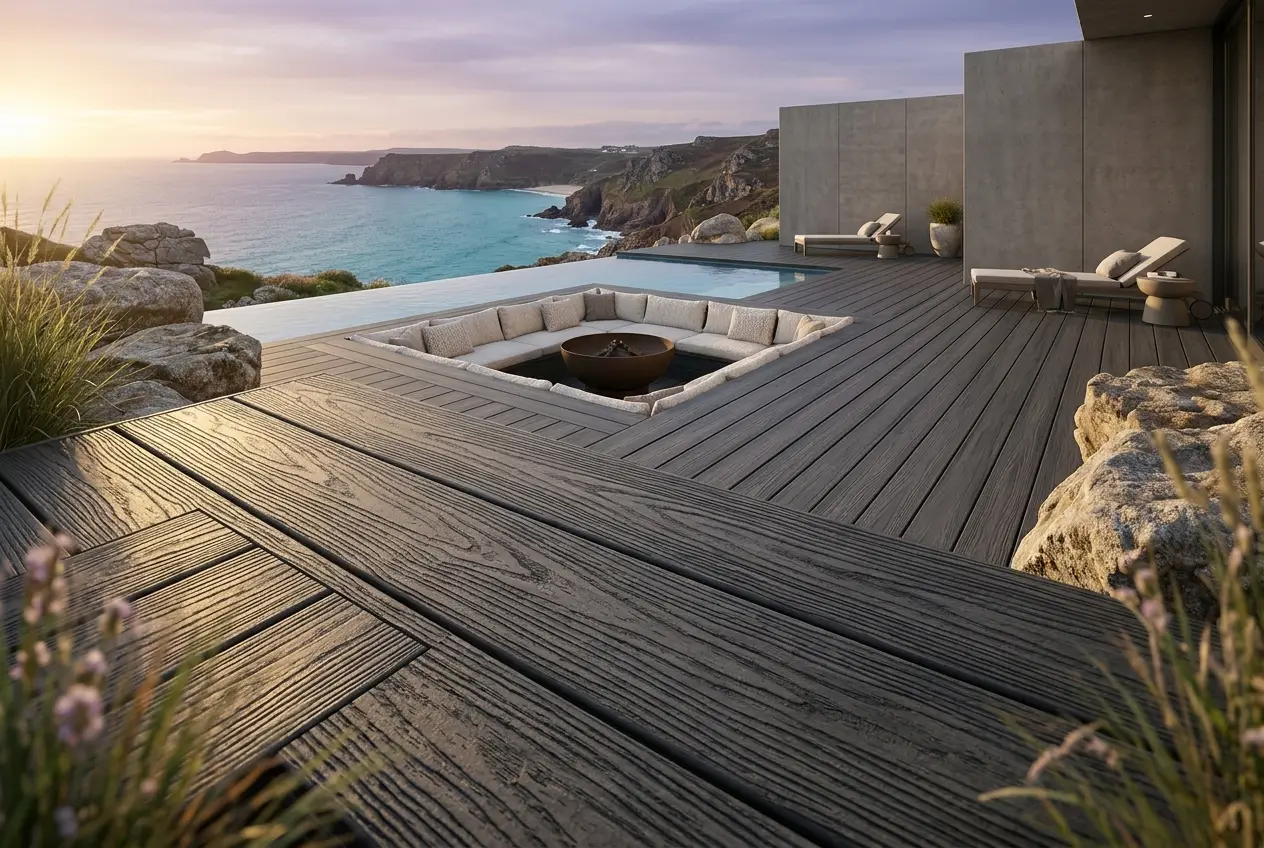 Composite decking delivering authentic wood grain aesthetics with non-slip safety performance in luxury residential and hospitality settings.